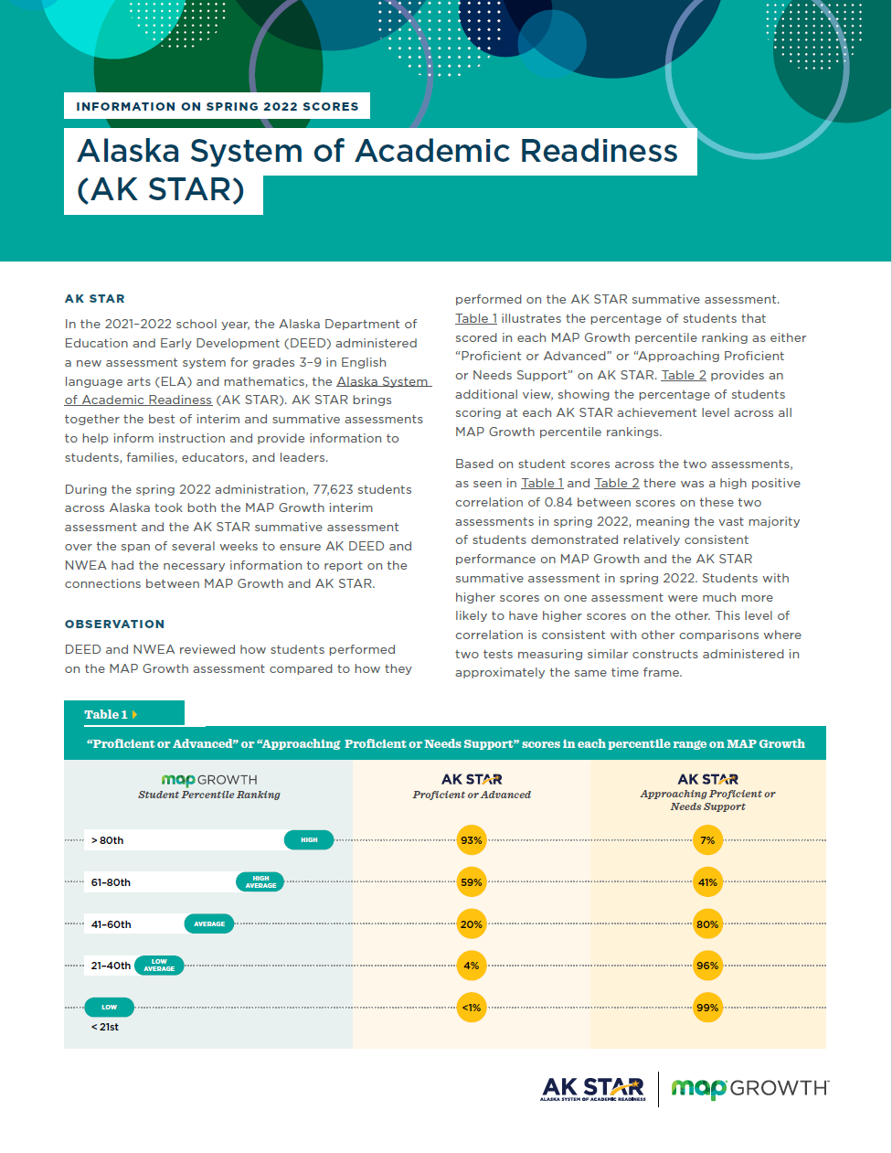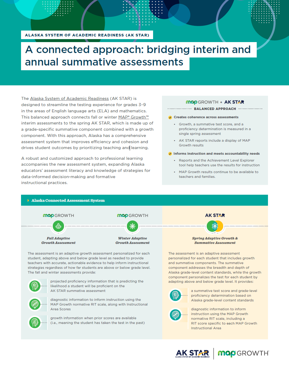Alaska's Department of Education and Early Development (DEED) has partnered with NWEA to implement a creative approach to balanced statewide assessment that better reflects learning throughout the school year and helps educators target instruction to students’ individual needs. The Alaska System of Academic Readiness (AK STAR) is designed to streamline the testing experience for grades 3–9 in the areas of English language arts (ELA) and mathematics. This balanced approach connects fall and winter MAP Growth interim assessments and the Alaska spring summative assessment to provide a comprehensive assessment system that improves efficiency and cohesion and drives student outcomes by prioritizing teaching and learning. A robust and customized approach to professional learning accompanies the new assessment system, expanding Alaska educators’ assessment literacy and knowledge of strategies for data-informed decision-making and formative instructional practices.