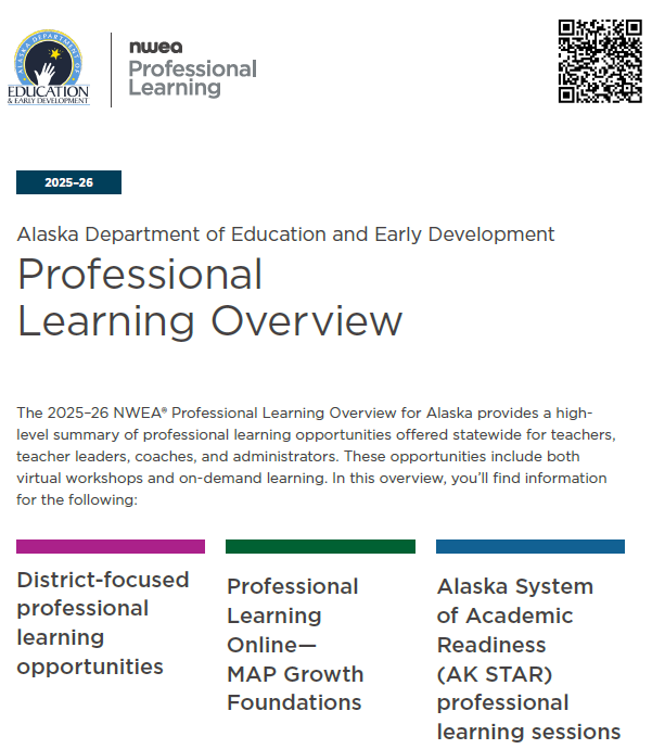 DEED and NWEA are happy to continue with professional learning offerings to schools and districts for the 2025-2026 school year. The 2025–26 Professional Learning Overview provides a summary of professional learning opportunities offered statewide for teachers, teacher leaders, coaches, and administrators. These opportunities include both virtual workshops and on-demand learning. Contact Kari Quinto, AK STAR Assessment Coordinator, for more information.